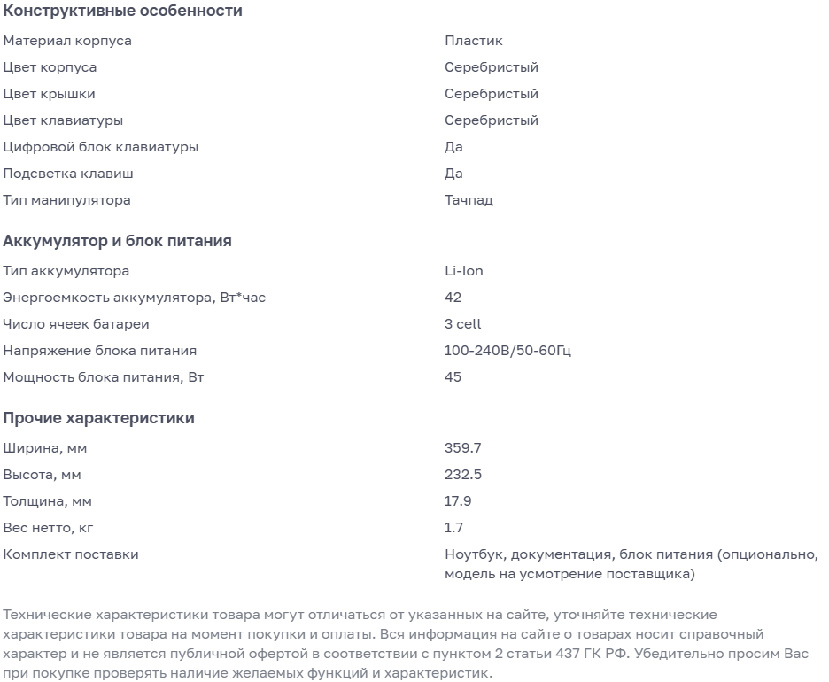 - Компактность и портативность: вес ноутбука всего 1,7 кг — его удобно брать с собой в поездки и на учёбу.